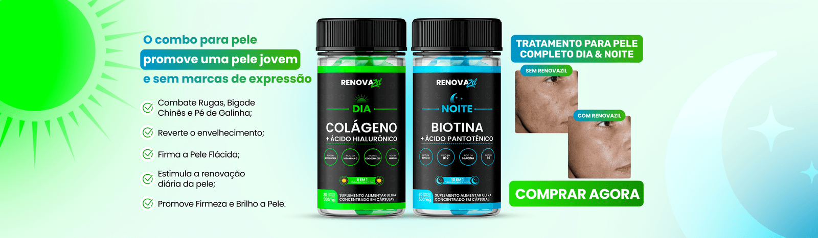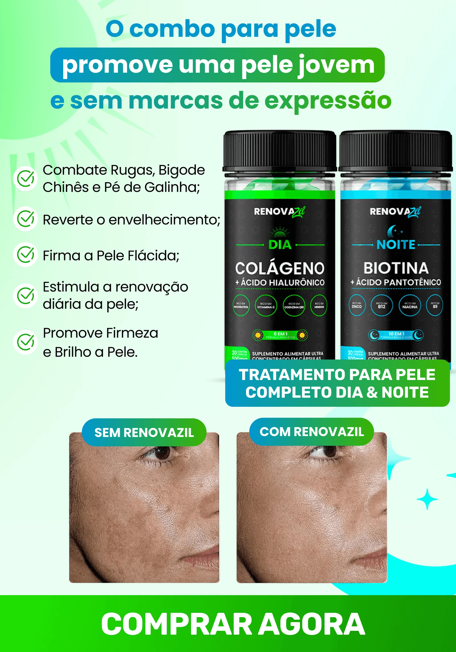 O Renovazil possui uma composição exclusiva Dia & Noite, agindo de dentro para fora diminuindo a aparência das rugas deixando a pele do seu rosto mais lisa e sem as marcas do tempo.